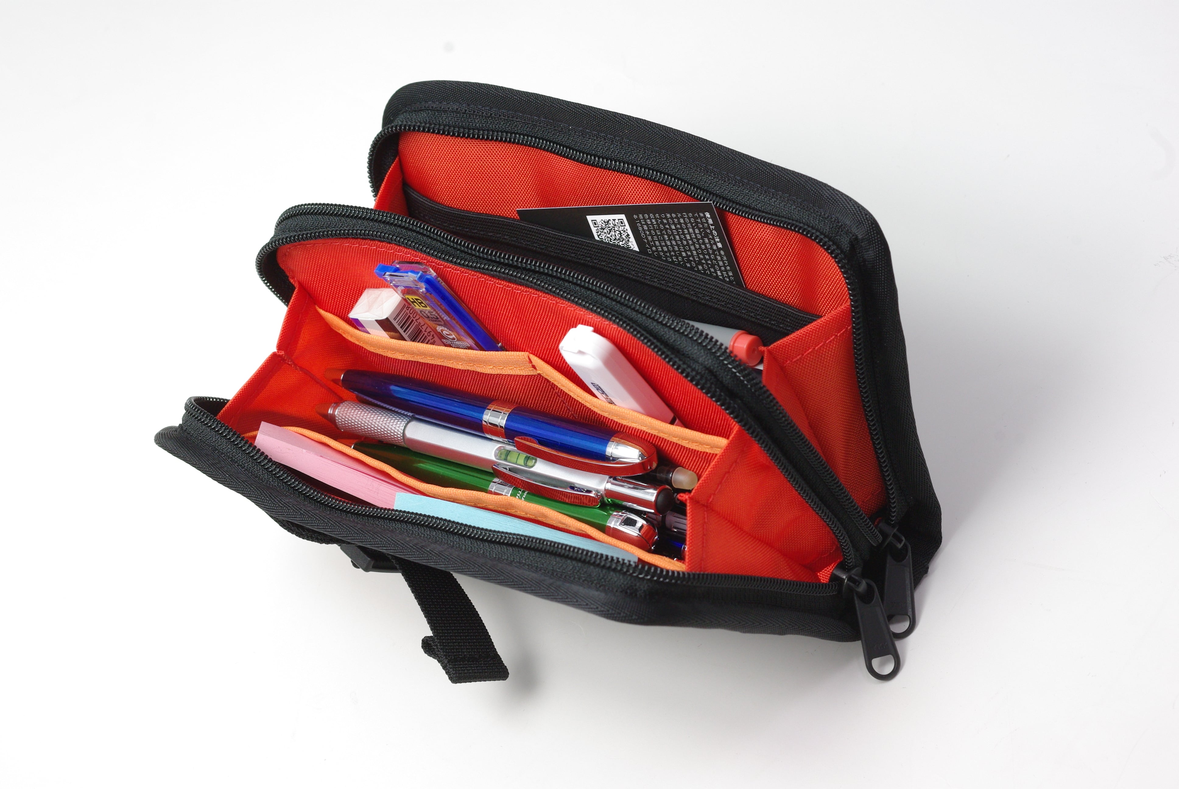 2ルーム構造のペンケースを丈夫で摩擦に強く耐久性に優れた素材と、撥水性の高い加工を施したナイロン素材で組み立てたタフな仕様。